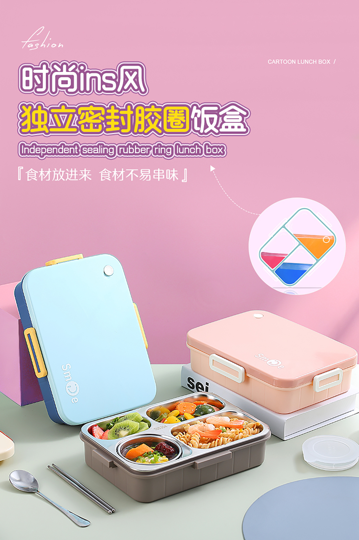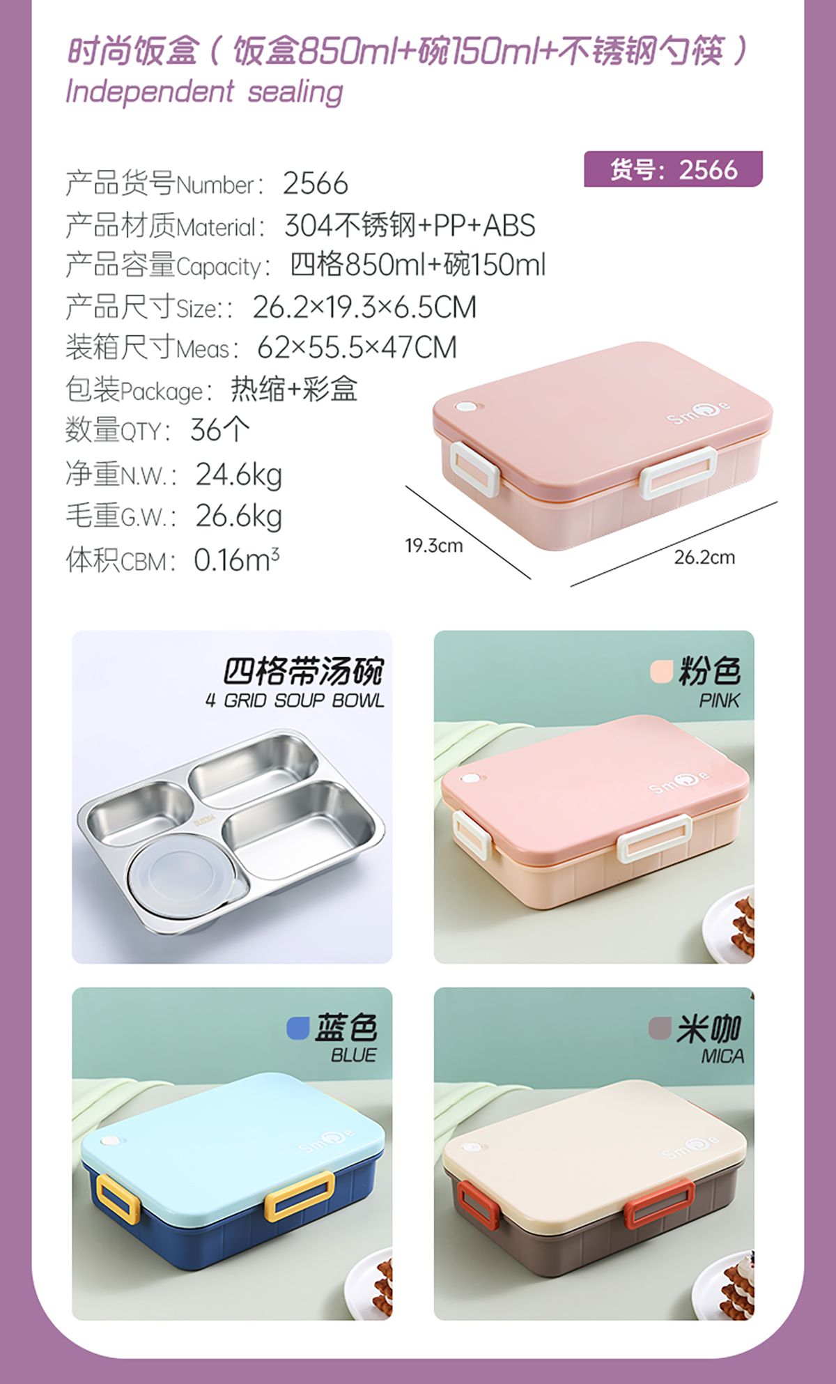 900ml獨(dú)立密封不銹鋼餐盒(時(shí)尚四格+不銹鋼勺筷/碗150ml不銹鋼勺筷)