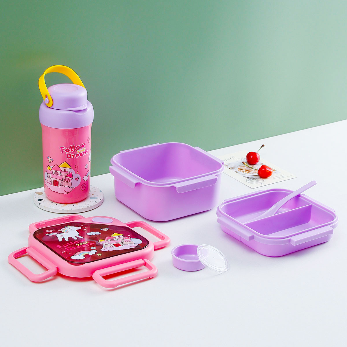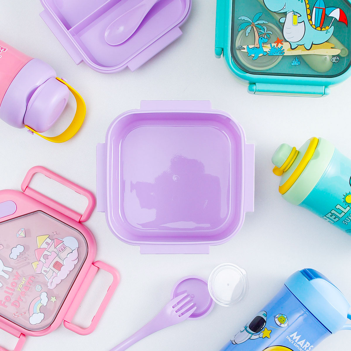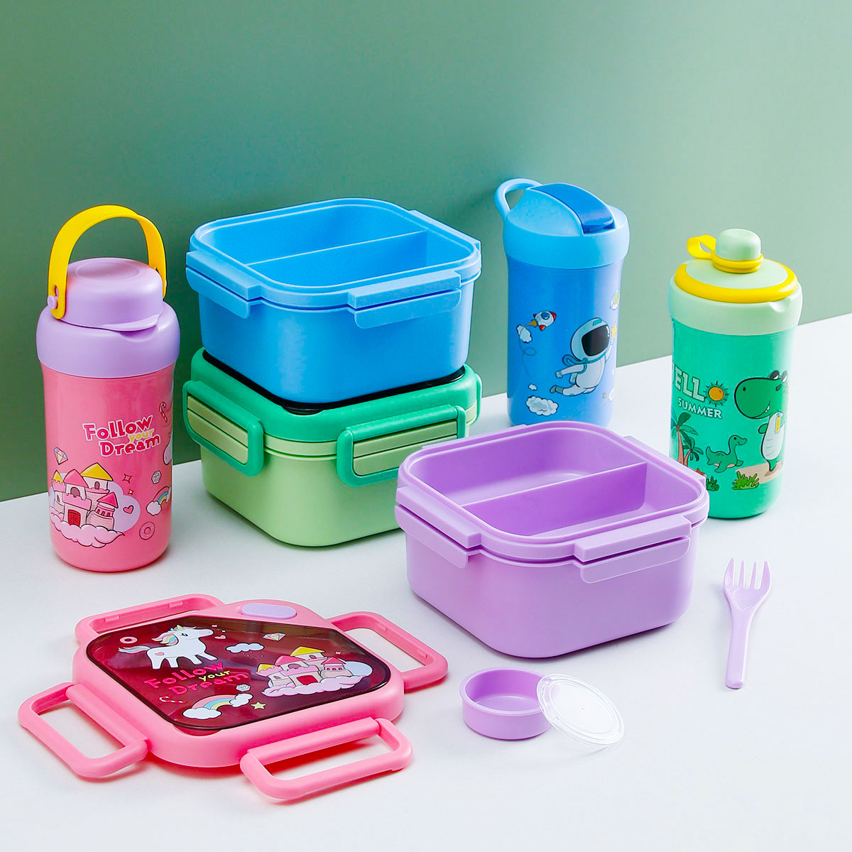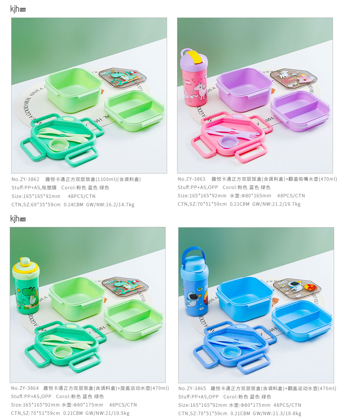 趣悅卡通正方雙層飯盒(含調(diào)料盒)+翻蓋吸嘴/旋蓋運動/翻蓋運動水壺