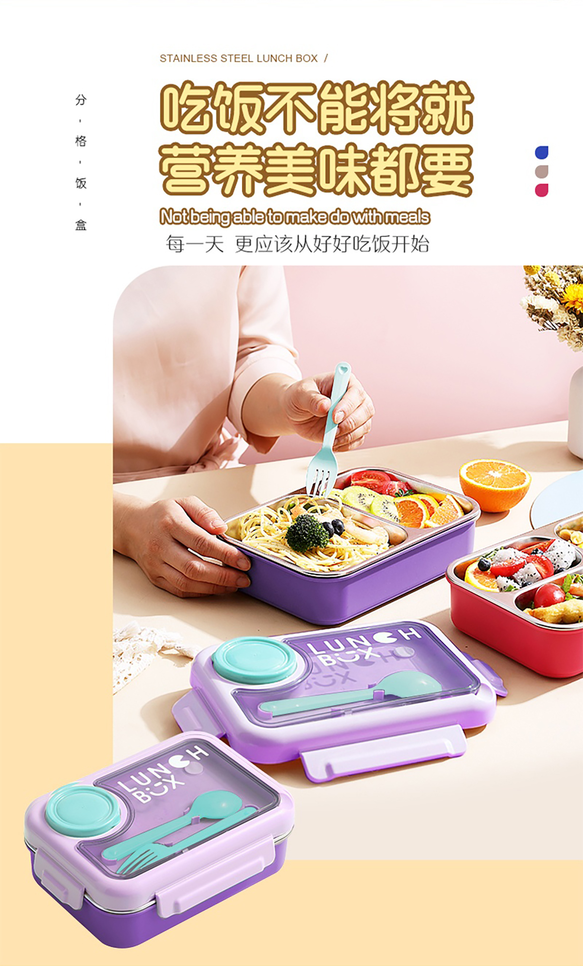 750ml獨(dú)立密封不銹鋼餐盒2格/3格+醬料杯80ml+PP勺叉