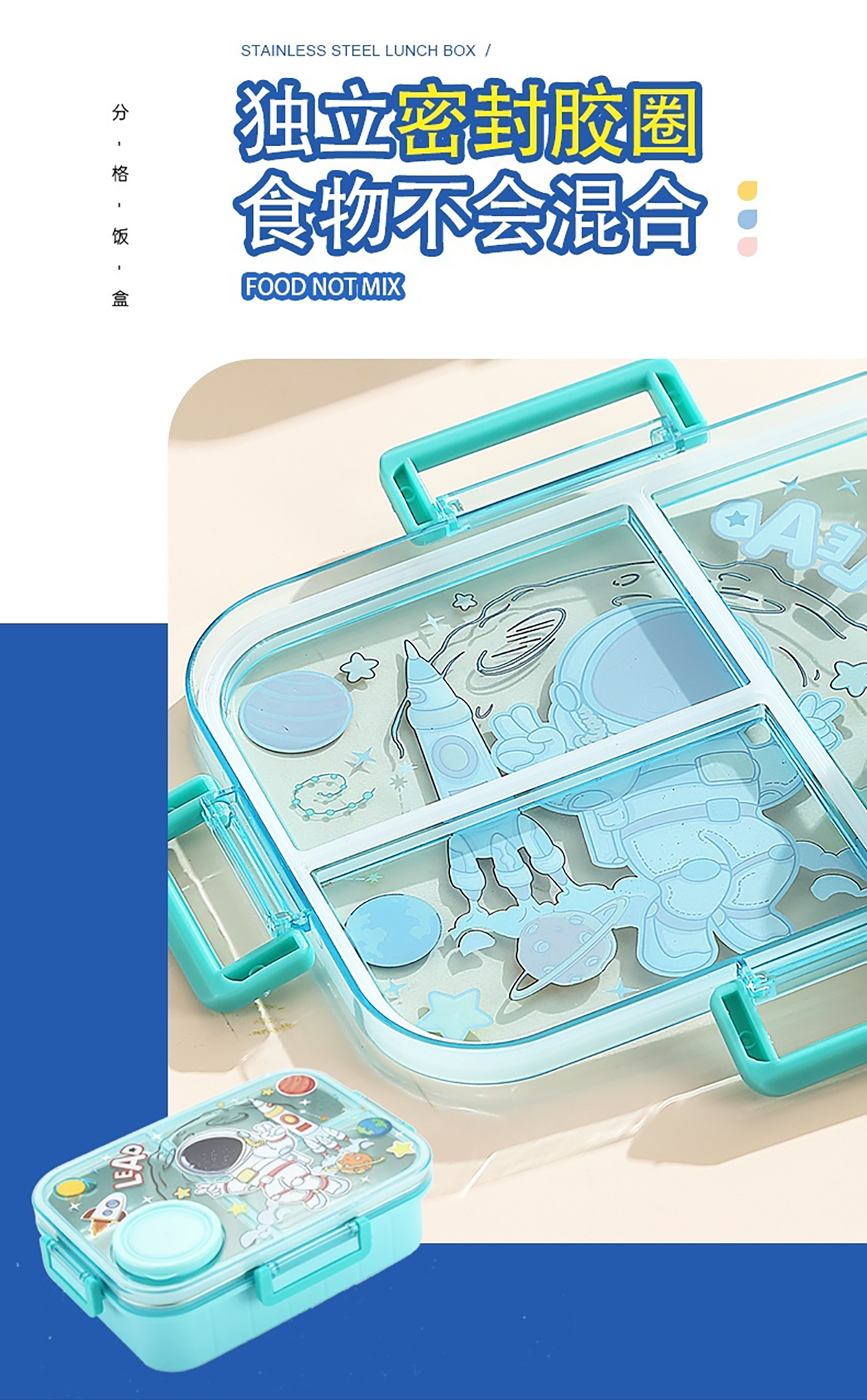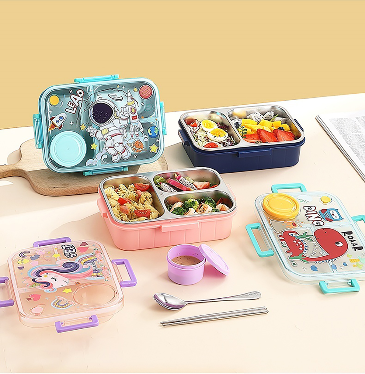 幻彩卡通獨立密封餐盒(2格800ml/3格750ml配不銹鋼勺筷+PP醬杯80ml)