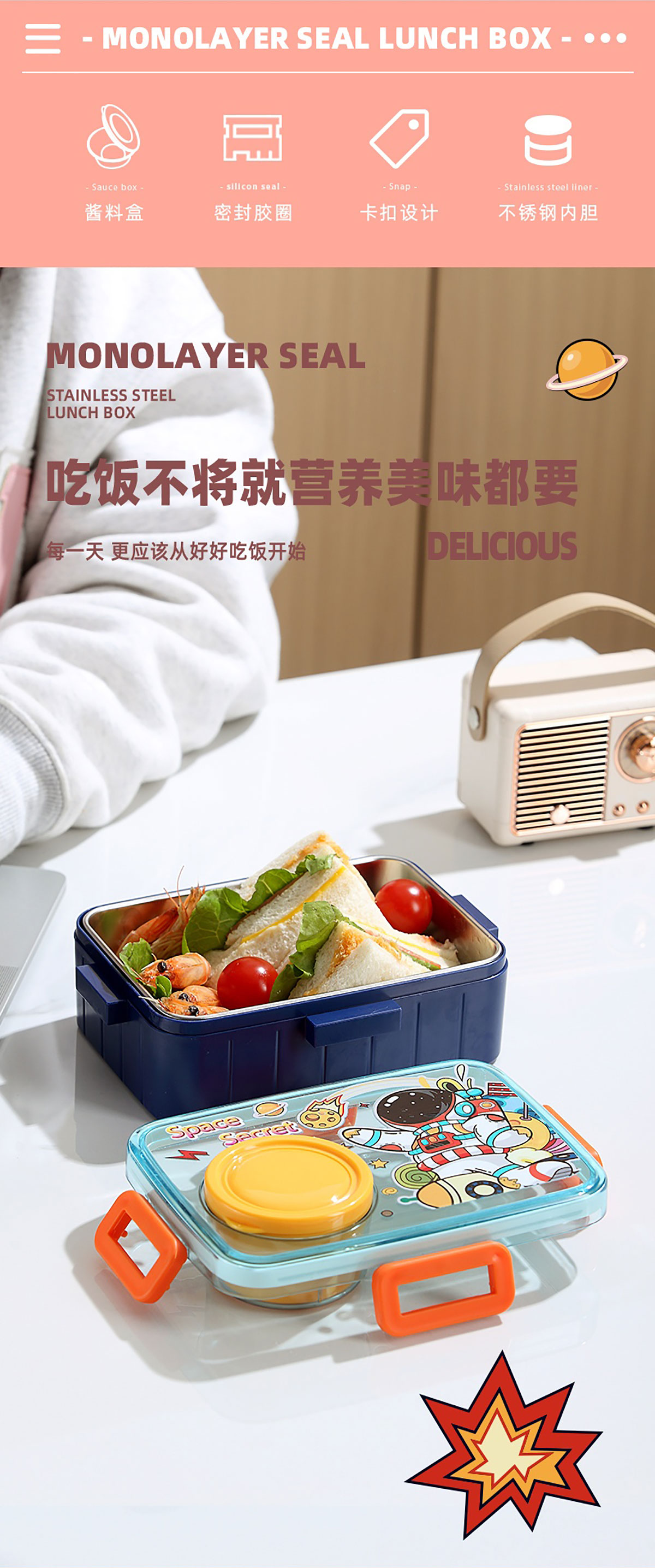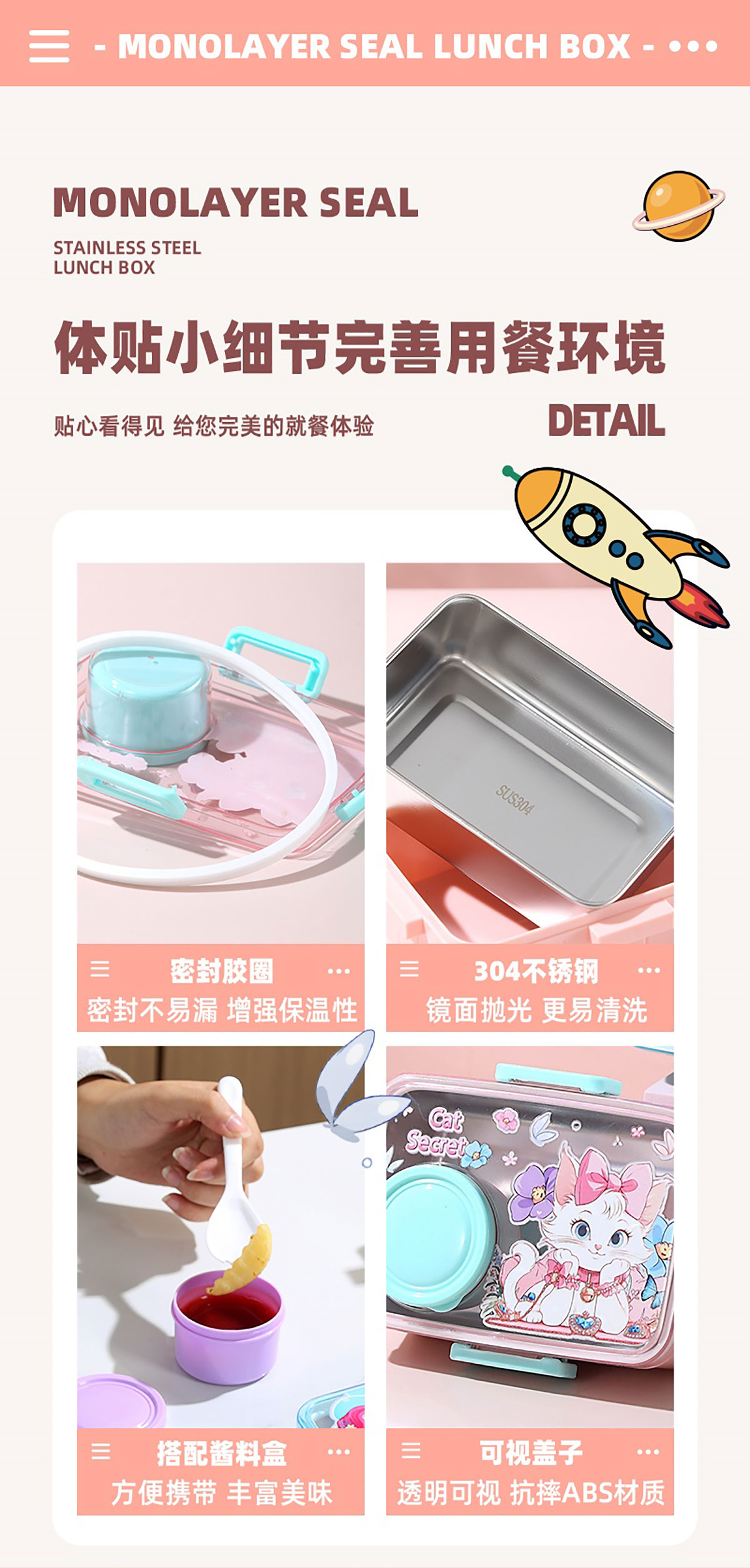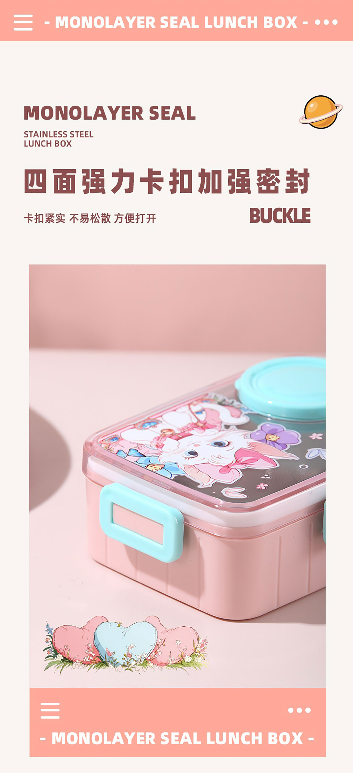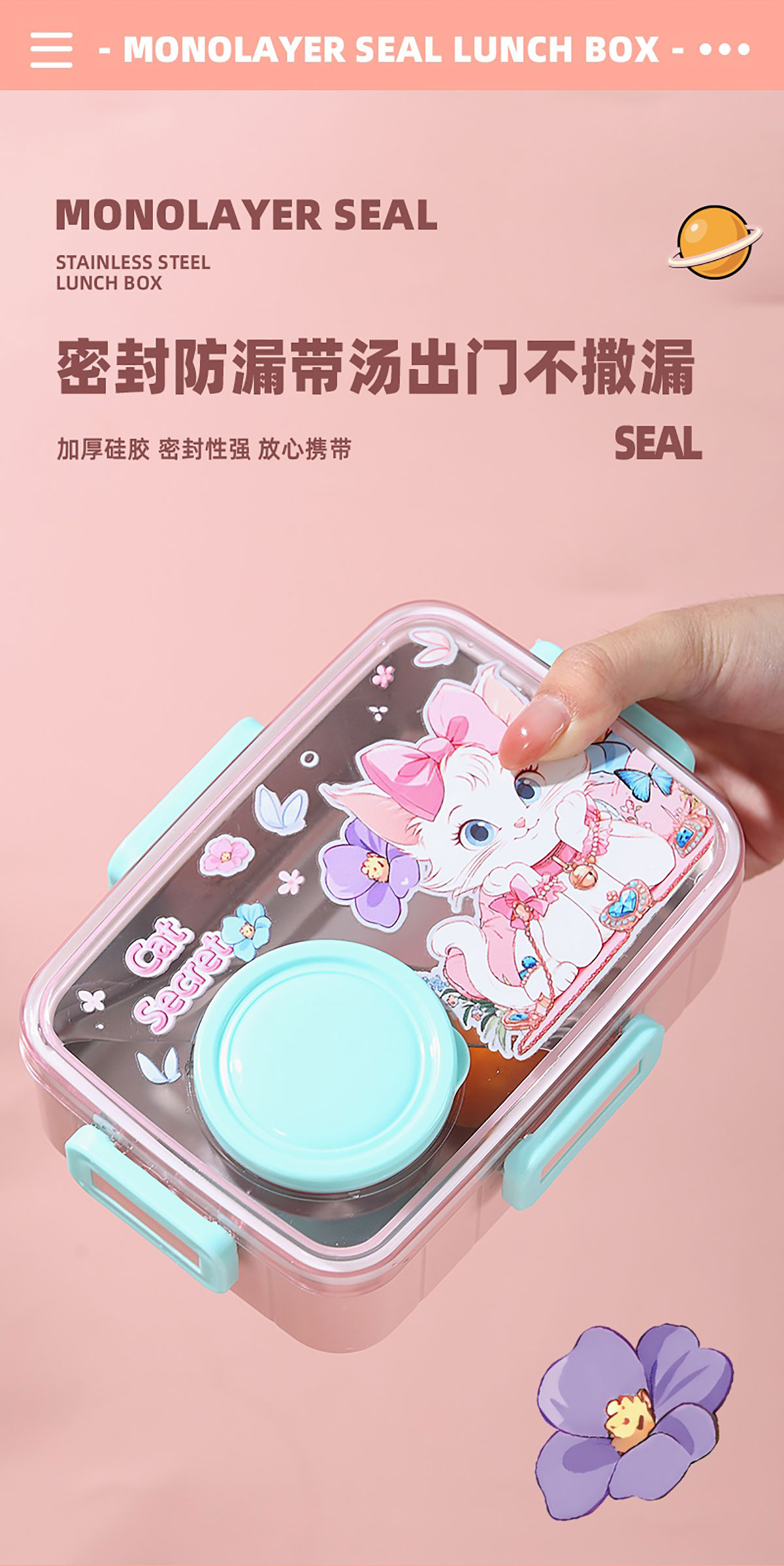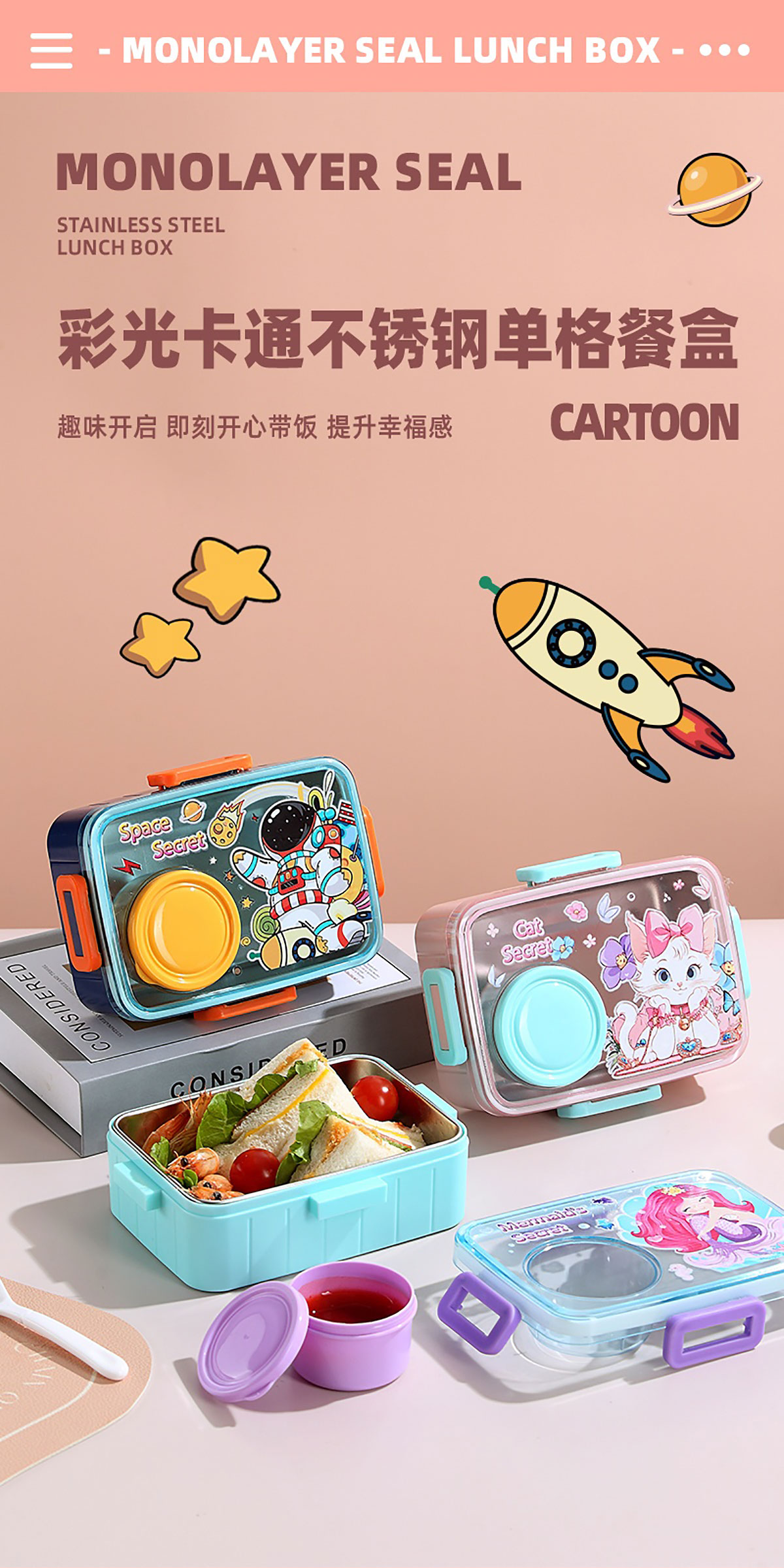 彩光卡通不銹鋼餐盒(單格600ml+外置醬料杯80ml)