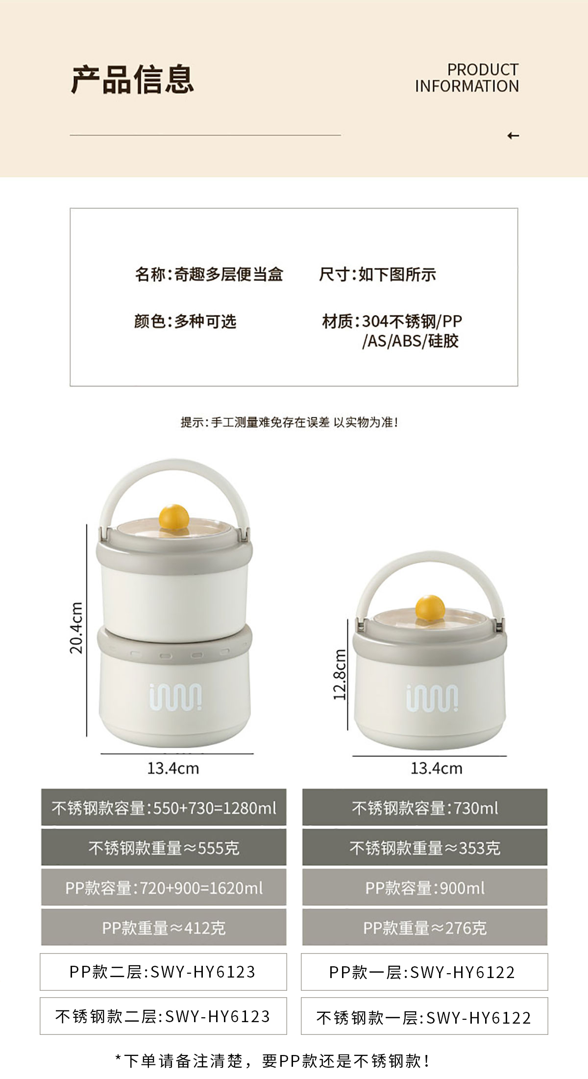 Size: SWY-HY6122(一層PP款):Φ134*128mm/900ml