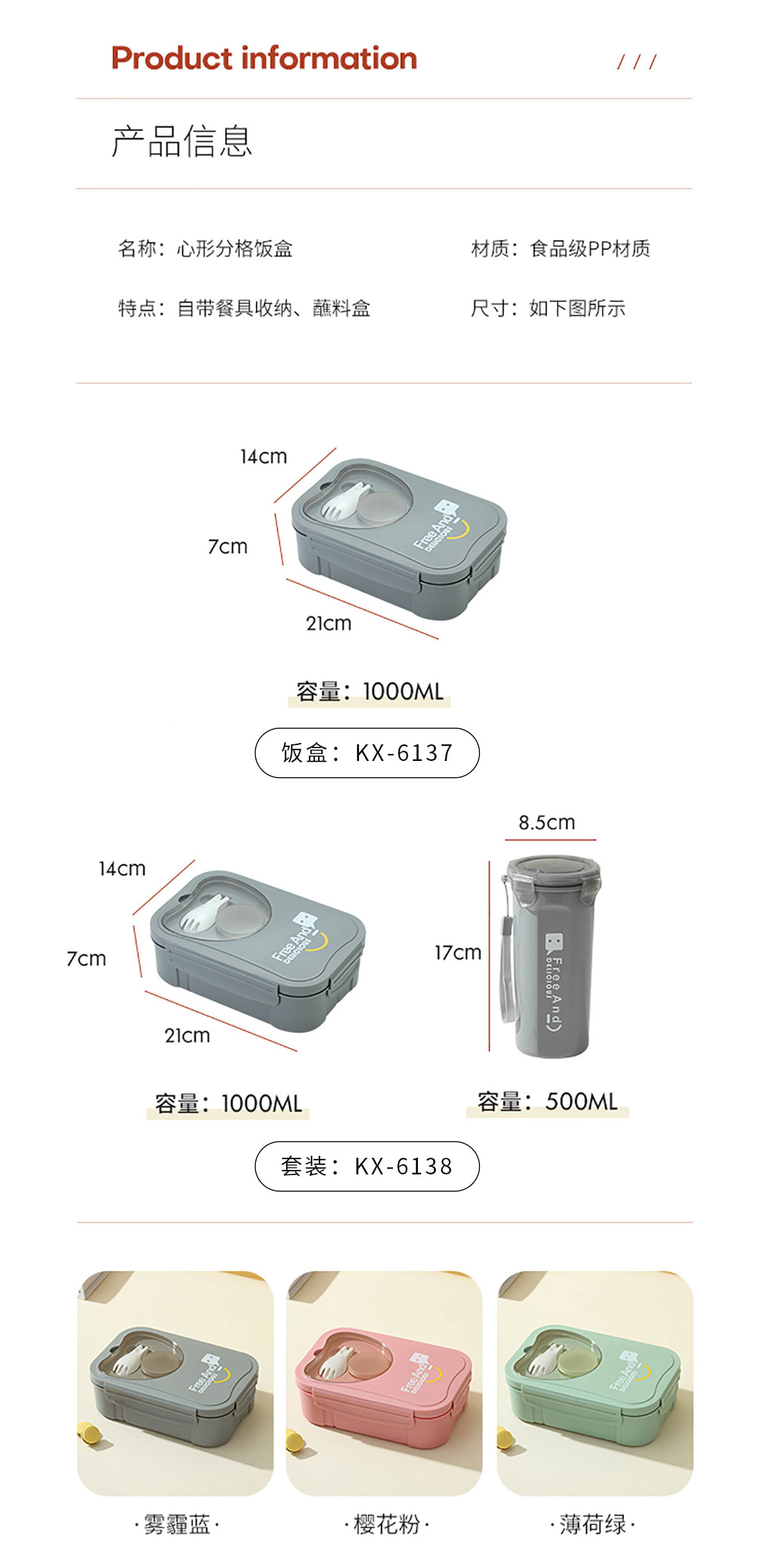 KX-6138:飯盒:210*140*70mm/1000ml 水壺:Φ85*170mm/500ml