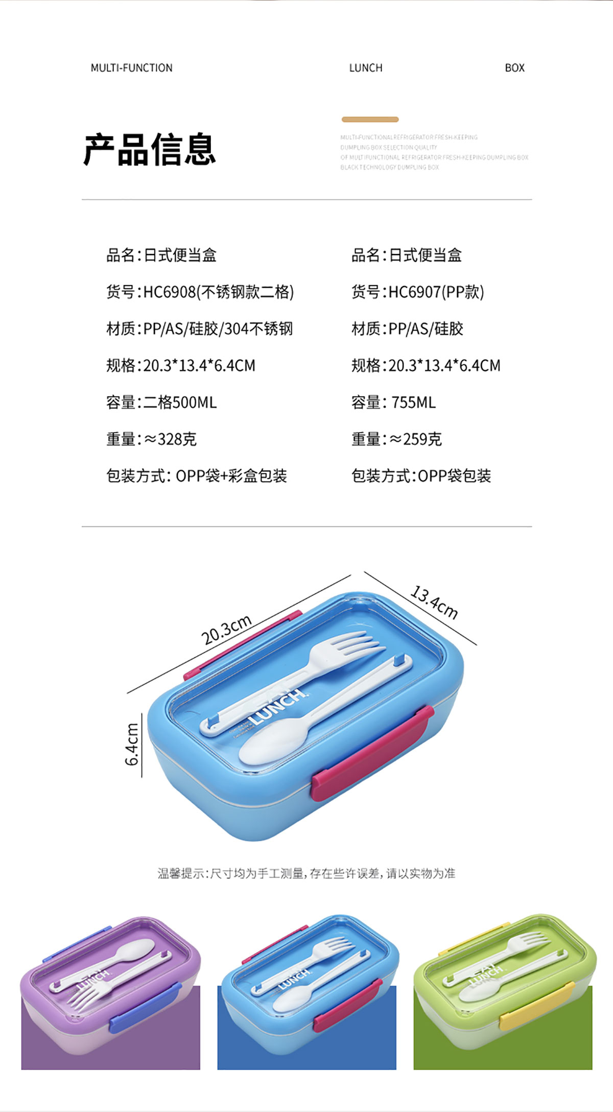 Size: SWY-HC6907(PP款二格):203*134*64mm/755ml