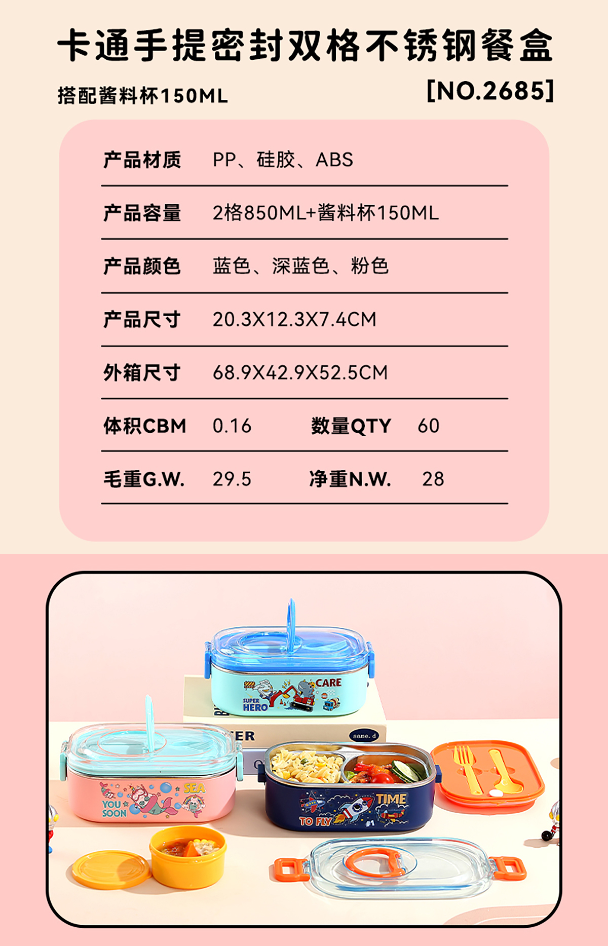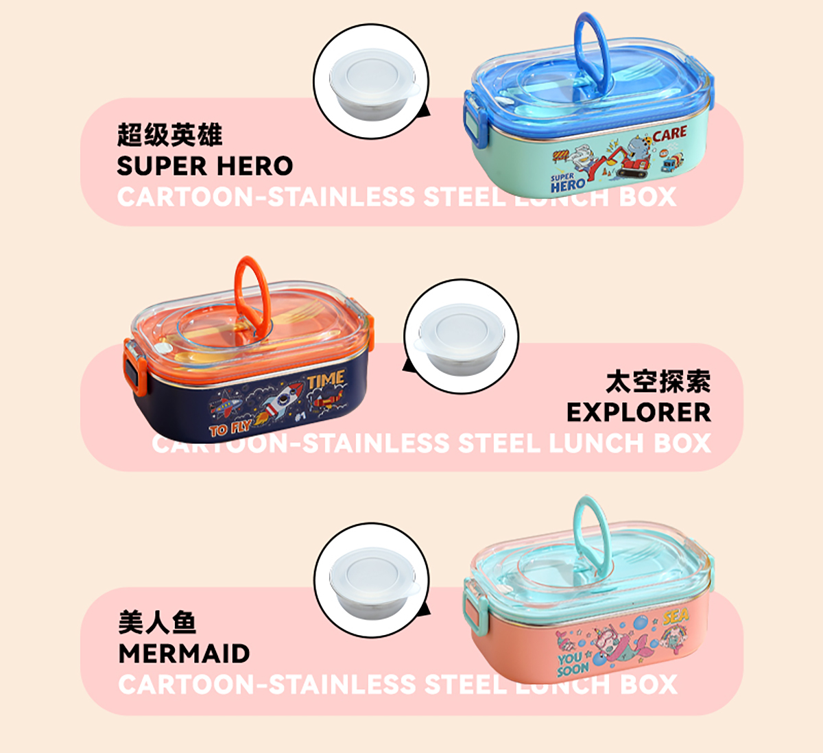 卡通手提密封不銹鋼餐盒(單格900ml/2格850ml+PP碗ml/2格850ml+不銹鋼碗150ml)